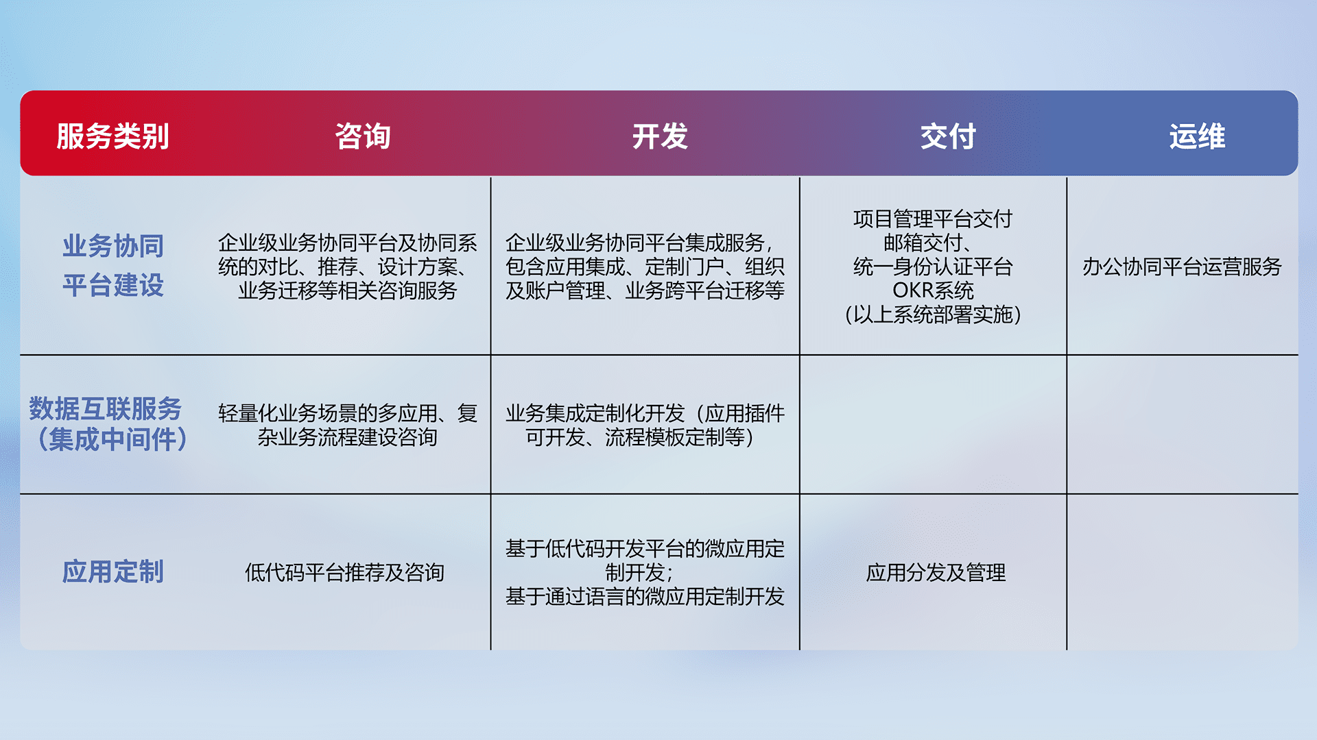 针对钉钉、、、企微、、、IDaas等平台级产品提供产品的规划、、方案、、、交付、、、、定制化开发等服务,,,,实现如统一协同办公、、、智能客户服务、、、混合会议管理、、、、智能数据查询、、等业务场景,,,实现数字化转型。。。。